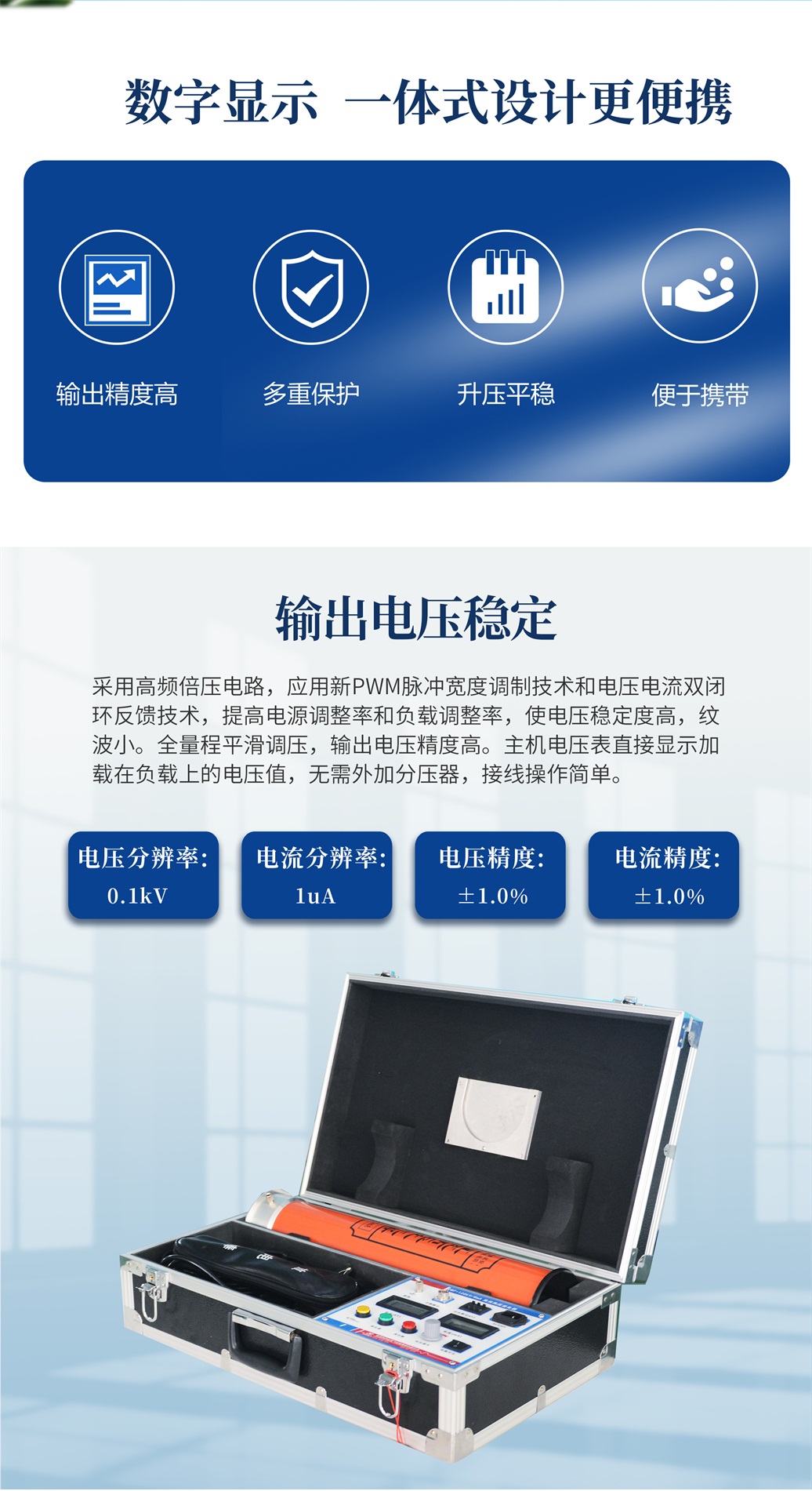 采用了高頻倍壓電路,應用了新的PWM高頻脈寬調制技術,閉環調整,采用了電壓大反饋,使電壓穩定度大幅度提高。使用性能卓越的大功率IGBT器件及驅動技術,并根據電磁兼容性理論,采用特殊屏蔽、隔離和接地等措施。使直流高壓發生器實現了高品質、便攜式,并能承受額定電壓放電而不損壞。具有輸出功率大、體積小的特點,有可靠的過壓、過流及零位合閘保護功能,帶0.75倍電壓切換功能。