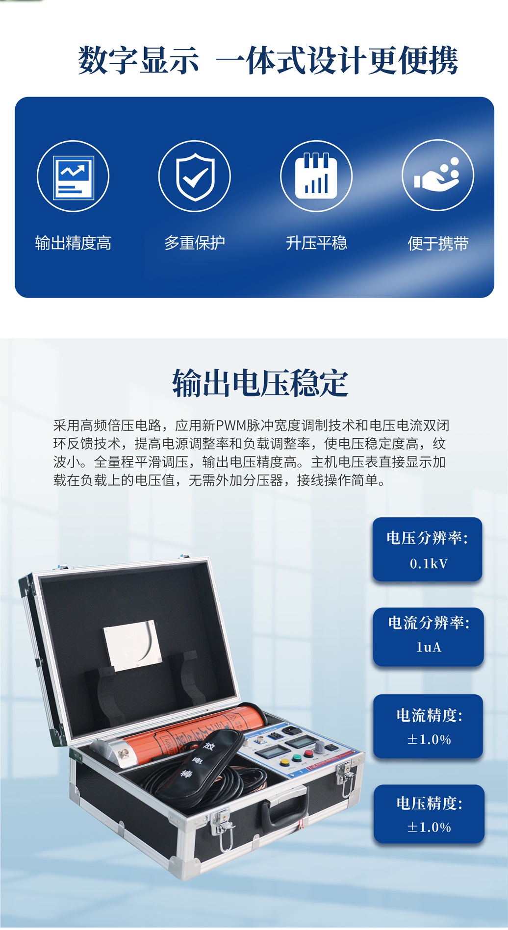 1、輸出電壓穩(wěn)定:采用高頻倍壓電路,應(yīng)用新PWM脈沖寬度調(diào)制技術(shù)和電壓電流雙閉環(huán)反饋技術(shù),提高電源調(diào)整率和負(fù)載調(diào)整率,使電壓穩(wěn)定度高,紋波小。全量程平滑調(diào)壓,輸出電壓精度高。主機(jī)電壓表直接顯示加載在負(fù)載上的電壓值,無需外加分壓器,接線操作簡單。電壓分辨率0.1kV,電流分辨率1uA。