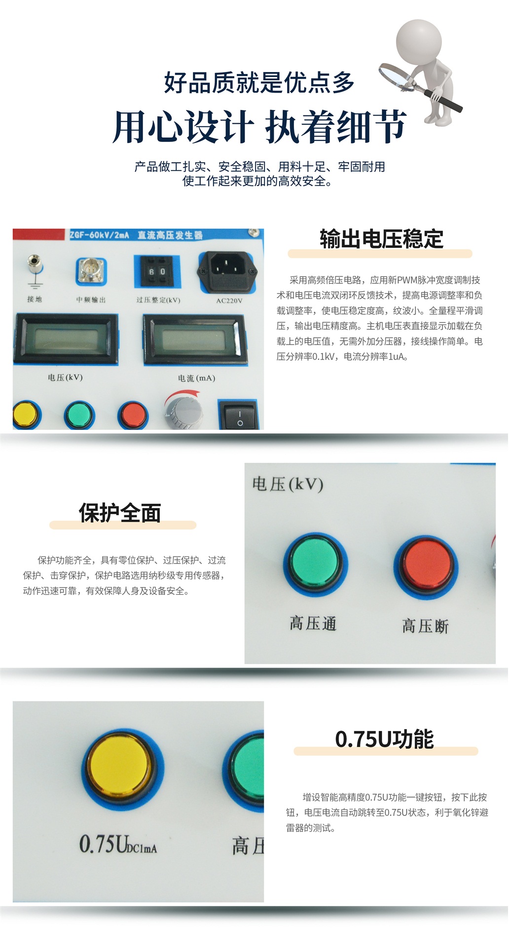 2、保護(hù)全面:保護(hù)功能齊全,具有零位保護(hù)、過壓保護(hù)、過流保護(hù)、擊穿保護(hù),保護(hù)電路選用納秒級專用傳感器,動作迅速可靠,有效保障人身及設(shè)備安全。