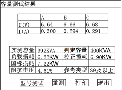 在測試結(jié)果界面按重測按鈕,則可重復一次測量。測試結(jié)果界面按打印按鈕,則可把測試結(jié)果以及備注界面錄入的信息打印輸出,若判定的型號為“S9及以上”時結(jié)果界面會顯示“型號測試”按鈕可以進一步準確判斷型號,之所以會出現(xiàn)“S9及以上”的結(jié)果是因為S9、S11和S13變壓器的負載損耗相同,若需測試具體型號還需“型號測試”結(jié)果。
