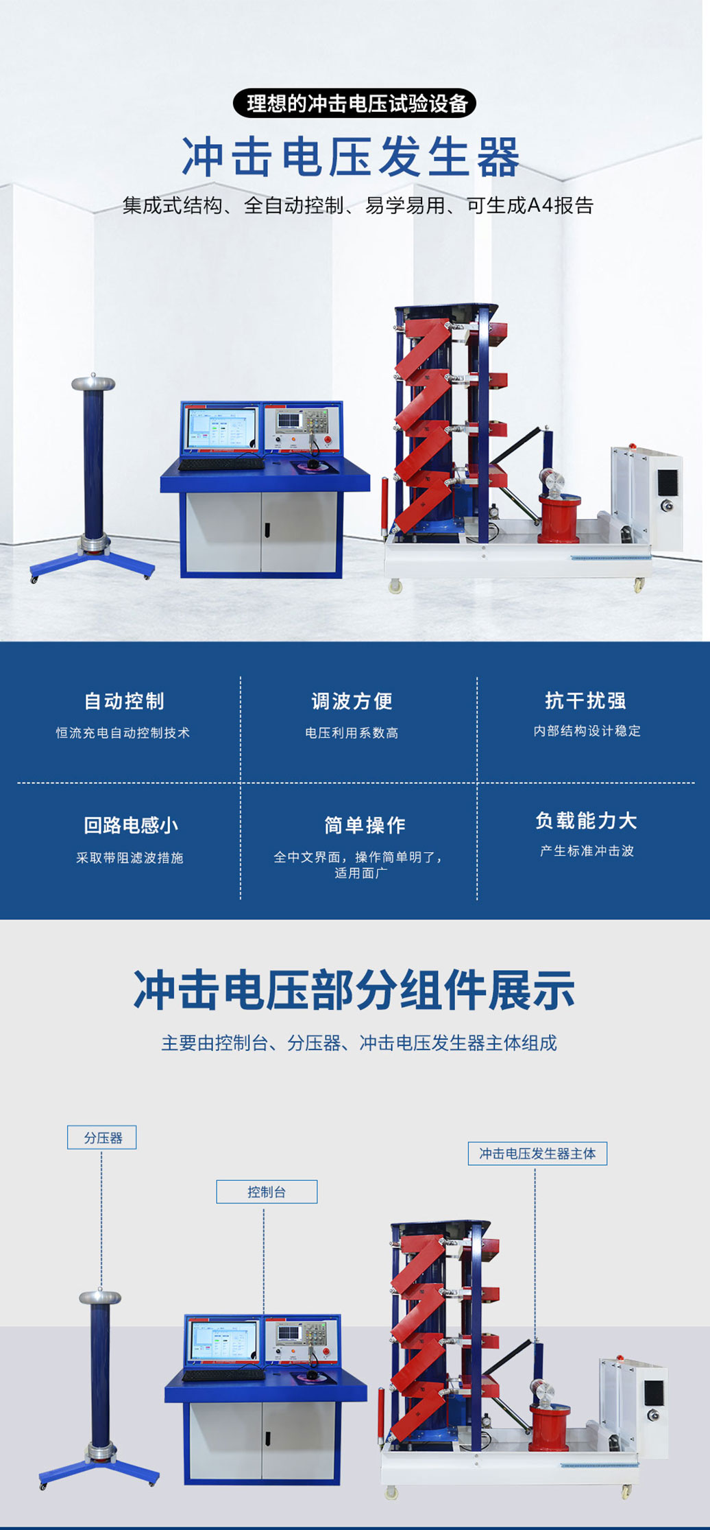 主要用于電力設備等試品進行雷電沖擊電壓全波、雷電沖擊電壓截波和操作沖擊電壓波的沖擊電壓試驗,檢驗絕緣性能。