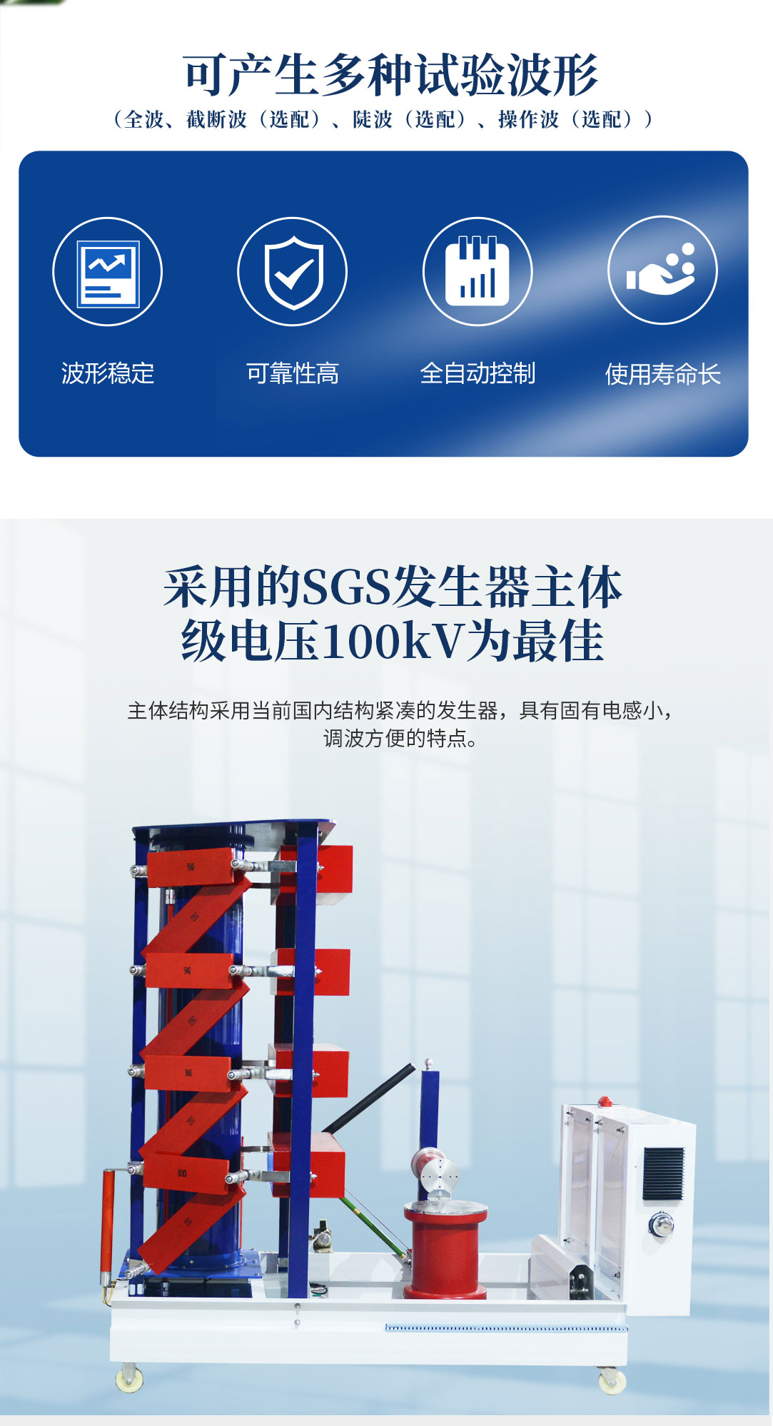 1、采用的SGS發(fā)生器主體,級電壓為100kV,符合當(dāng)前國內(nèi)外的發(fā)展趨勢。主體結(jié)構(gòu)采用當(dāng)前國內(nèi)結(jié)構(gòu)緊湊的發(fā)生器,具有固有電感小,調(diào)波方便的特點(diǎn)。
