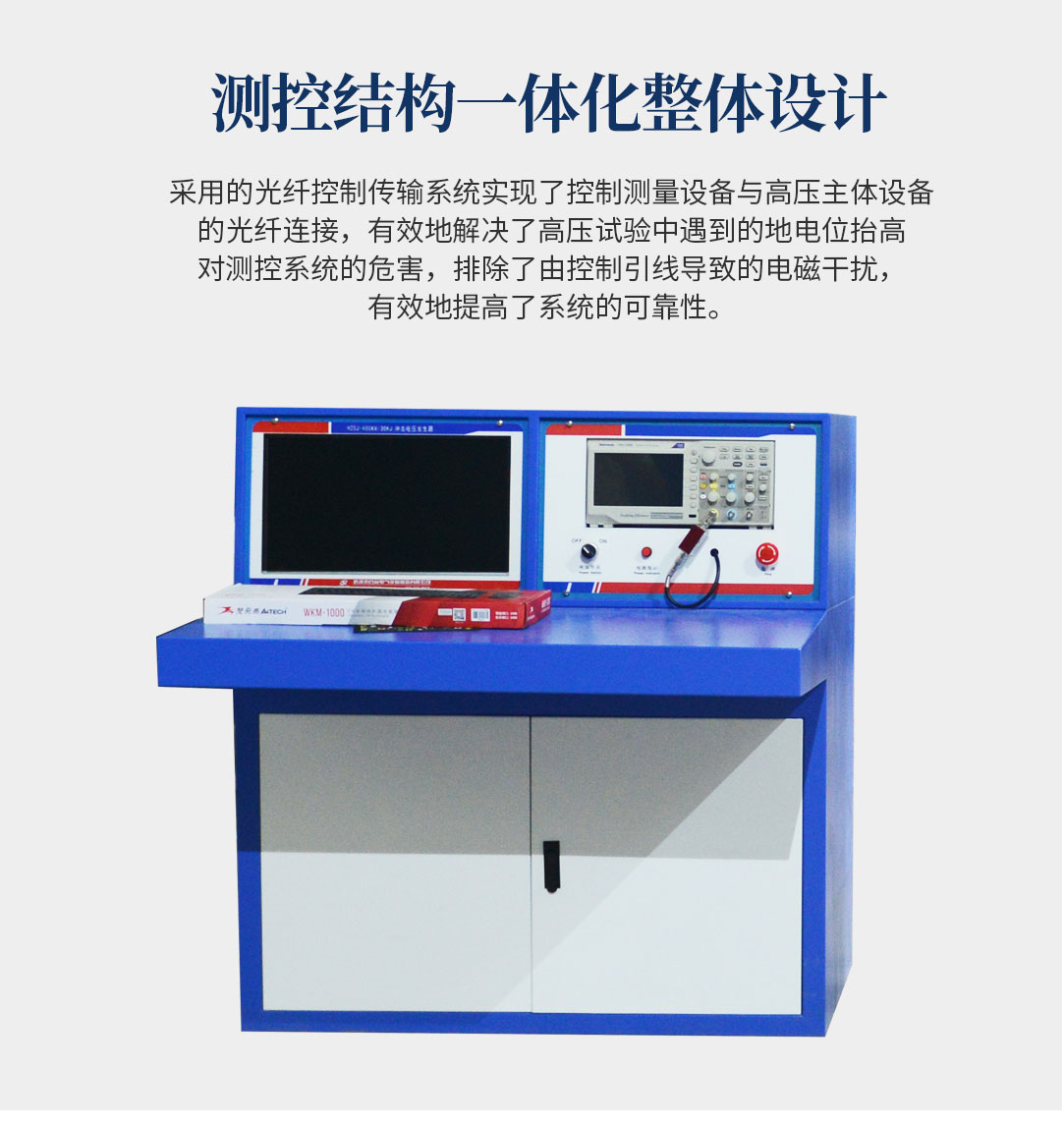 4、采用的光纖控制傳輸系統(tǒng)在國內(nèi)高壓試驗(yàn)設(shè)備中是創(chuàng)新,它實(shí)現(xiàn)了控制測量設(shè)備與高壓主體設(shè)備的光纖連接,有效地解決了高壓試驗(yàn)中遇到的地電位抬高對測控系統(tǒng)的危害,排除了由控制引線導(dǎo)致的電磁干擾,極大地提高了系統(tǒng)的可靠性。