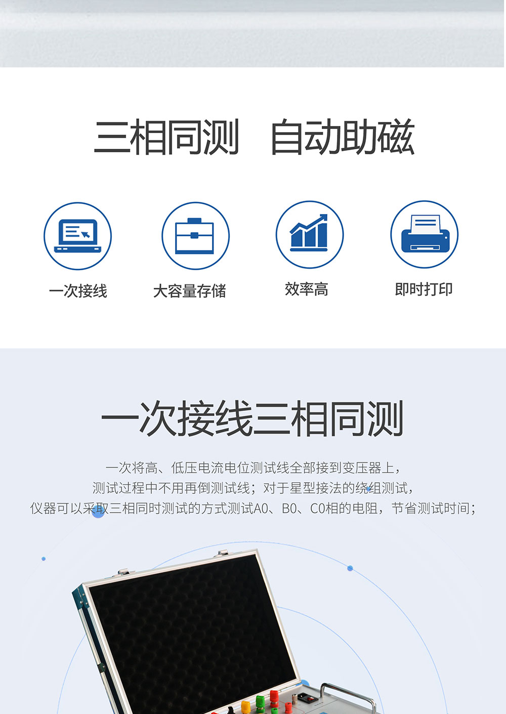 三通道直流電阻測試儀(以下簡稱直阻儀)是變壓器直流電阻測量的最新一代產品,是為測量大容量變壓器三相繞組直流電阻而優化設計的。可對變壓器的三相繞組直流電阻進行同時測試。對有載調壓變壓器可以不需要放電,直接調節分接開關,測量時間是傳統單相測量的三分之一,可大大縮短工作時間和勞動強度。