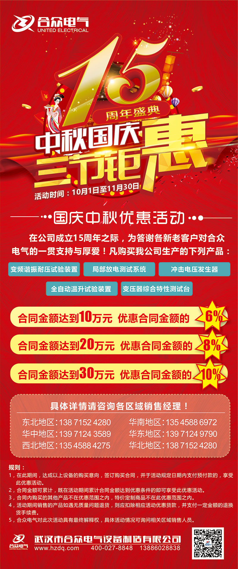 中秋國慶佳節即將來臨,在這個美好而又祥和的時候,也正值我司成立十五周年的誕辰,在這個三節同慶的日子里,我司為了回饋各位新老客戶多年來對我司的信任和支持,現正式啟動“合眾十五載,感恩一路有你”為主題的國慶中秋優惠活動,凡在10月1日至11月30日期間購買我司設備,合同金額達到一定金額將享受到巨額優惠,詳細活動細節請看上圖,在近期有采購意向的朋友,請抓住這次千載難逢的大好機會,趕緊拿起手機行動起來吧!