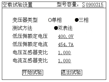 2)在變壓器綜合測(cè)試儀主界面中選擇空載試驗(yàn),則顯示空載試驗(yàn)設(shè)置界面如下圖: