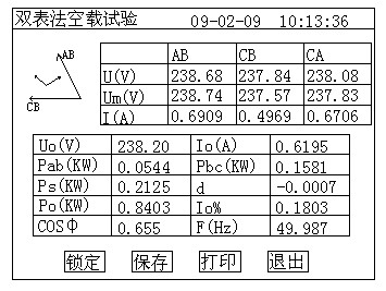 圖8完整的顯示了變壓器綜合測(cè)試儀空載試驗(yàn)的所有測(cè)試結(jié)果:Uo(V)為三相線電壓的平均值,Ps(KW)為當(dāng)前電壓下的實(shí)測(cè)功率,d為電壓波形畸變系數(shù),Po(KW)為校正后的空載損耗,Io%為空載電流百分比。