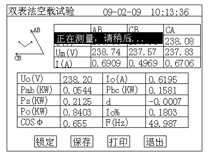 左上側(cè)為試驗(yàn)電壓、電流的向量圖,如果接線錯(cuò)誤,該頁(yè)面提示“接線錯(cuò)誤,請(qǐng)關(guān)機(jī)檢查”;通過(guò)調(diào)壓器緩慢增加試驗(yàn)電壓,當(dāng)Uo(V)等于空載試驗(yàn)的額定電壓時(shí),停止升壓。移動(dòng)光標(biāo)到“鎖定”按鈕,長(zhǎng)按OK鍵將出現(xiàn)圖9正在測(cè)量的提示,此時(shí)保持調(diào)壓器不動(dòng),當(dāng)圖9中的正在測(cè)量的提示消息消失后,當(dāng)前測(cè)試結(jié)果已經(jīng)被鎖定,然后“鎖定”按鈕變?yōu)椤爸販y(cè)”按鈕,此時(shí)請(qǐng)迅速操作調(diào)壓器降壓至零位。