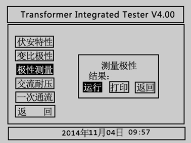 在CT測(cè)試主界面中光標(biāo)選擇極性測(cè)量選項(xiàng),點(diǎn)擊旋轉(zhuǎn)鼠標(biāo)進(jìn)入CT極性測(cè)量界面如圖3.22所示。CT極性試驗(yàn)接線與CT變比極性試驗(yàn)接線方式相同,按下互感器綜合特性測(cè)試儀運(yùn)行后,儀器會(huì)自動(dòng)檢測(cè)所連接CT的極性。選擇打印選項(xiàng)則將試驗(yàn)結(jié)果打印,選擇返回選項(xiàng)則返回至CT試驗(yàn)主界面。