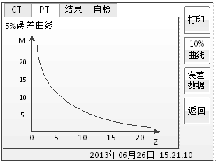 在智能互感器測試儀圖2.15中,還可以選擇顯示10%的誤差曲線。智能互感器測試儀保護互感器的10%誤差曲線是10%誤差數據的圖形化顯示,其含義是相同的,其含義為互感器復合誤差不大于10%時,其二次負荷與過流倍數的關系曲線。5%的誤差曲線是互感器復合誤差不大于5%時,其二次負荷與過流倍數的關系曲線。